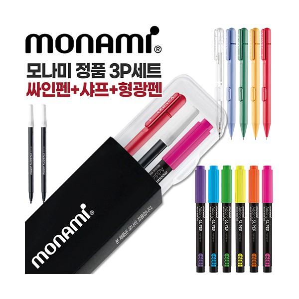 모나미 클리키샤프0.5+어데나컴퓨터용싸인펜+에딩슈퍼형광펜600 3P세트