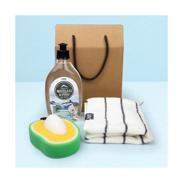 - 베이킹소다 주방세제 500ml + 프리미엄 모달 주방타올 + 과일수세미 + 끈케이스