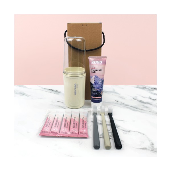 휴대용 양치컵 + 2080 핑크솔트 치약 120g + 2080 핑크솔트 가글 마우스워시 5매 + Nard나드 이중미세모 칫솔 3개+종이케이스