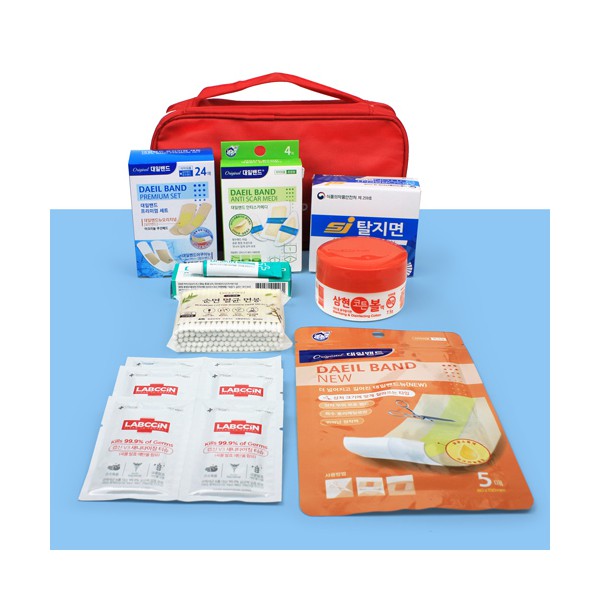 - 프리미엄 구급함 대일밴드 (아쿠아방수 표준8대형4+오리지널 표준8+대형4)+특대형 + 안티스카 습윤밴드 + 닥터스킨연고 + 탈지면 + 알콜솜 + 소독티슈 + 구급파우치