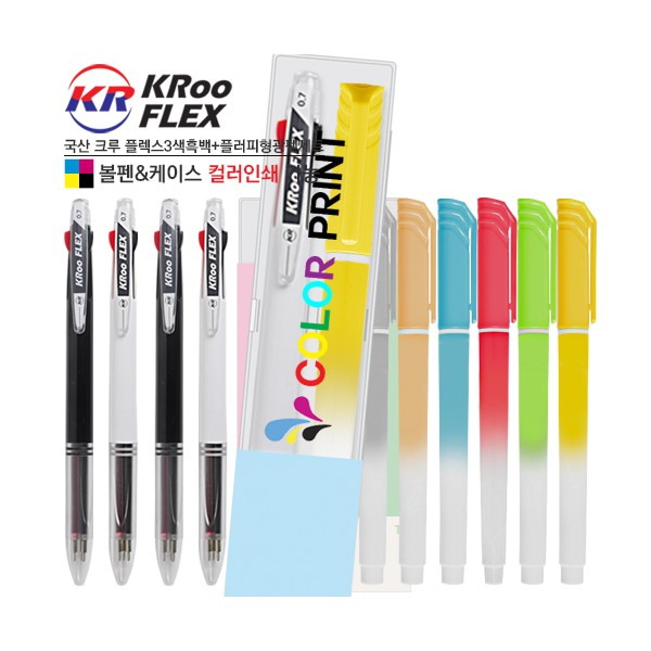 국산 크루 플렉스3색흑백볼펜 플러피형광펜세트
