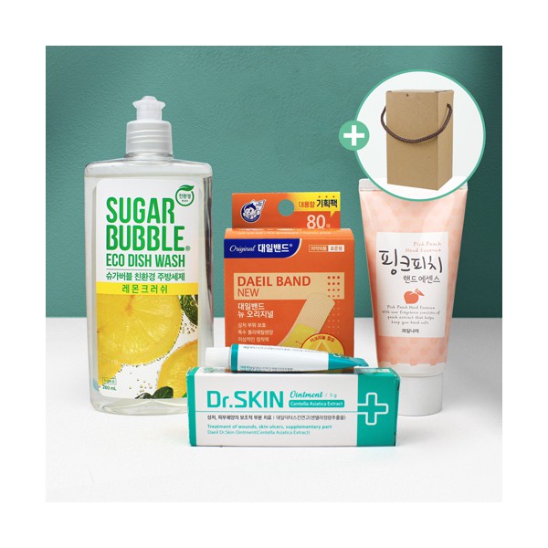 - 주방 필수품, 슈가버블 주방세제 280ml + 정품 대일밴드 대용량 80매 + 닥터스킨연고 + 과일나라 핑크피치 핸드크림 + 끈케이스