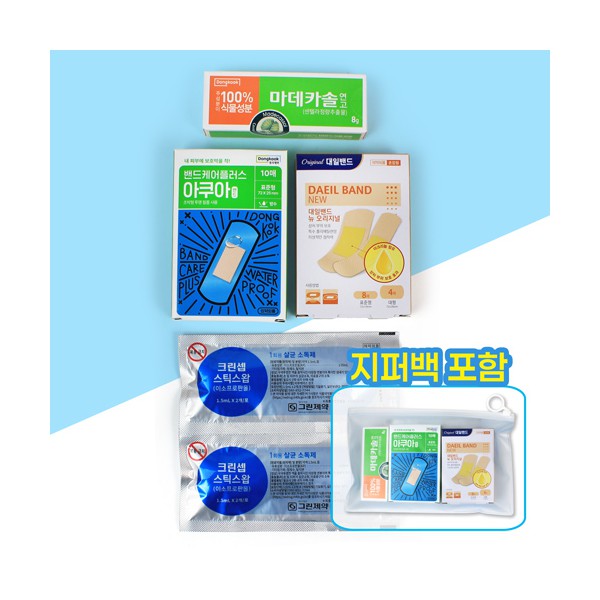 마데카솔 연고8g + 대일밴드 혼합 12매 + 동국제약 아쿠아 방수밴드 10매 + 스틱스왑 소독봉 2매입 2개 + 지퍼백 + 종이케이스 별도문의