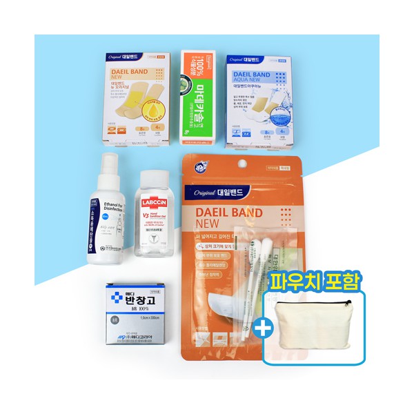 잘라쓰는 대일밴드 특대형 5매 + 마데카솔 연고 8g + 대일밴드 혼합 12종 + 대일밴드 방수 혼합 12종 + 스프레이 에탄올 소독제 + 랩신 손소독티슈 60ml + 상처 처치용 소독면봉 + 에코파우치 + 종이케이스 추가 별도문의