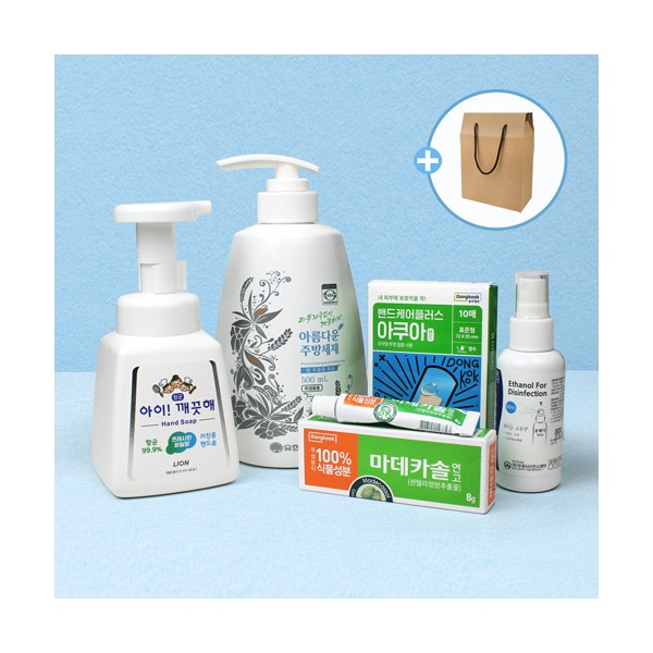 유한양행 아름다운 주방세제 500ml + 주방전용 키친솝 아이깨끗해 + 동국제약 아쿠아 방수밴드 + 마데카솔 연고 + 소독 에탄올 스프레이형 + 끈케이스