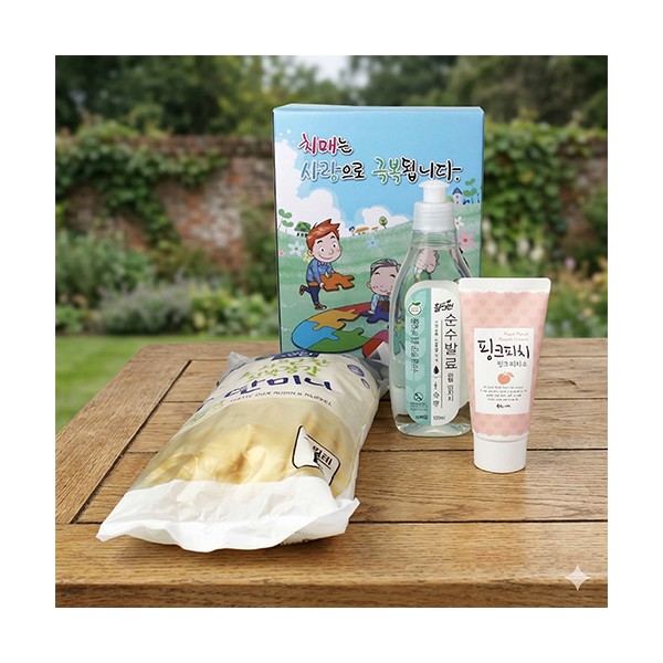 - 치매예방 홍보세트 참그린 주방세제 + 단미니고무장갑 10켤레 + 과일나라 핑크피치 핸드크림 + 치매예방 홍보케이스 + 케이스 이미지 변경 가능