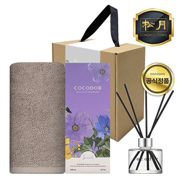송월타월1장, 코코도르 디퓨저 1개, 일체형 손잡이박스, 속지, 감사스티커(랜덤)