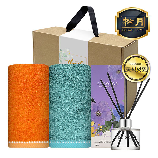 송월타월2장, 코코도르 디퓨저 1개, 일체형 손잡이박스, 속지, 감사스티커(랜덤)