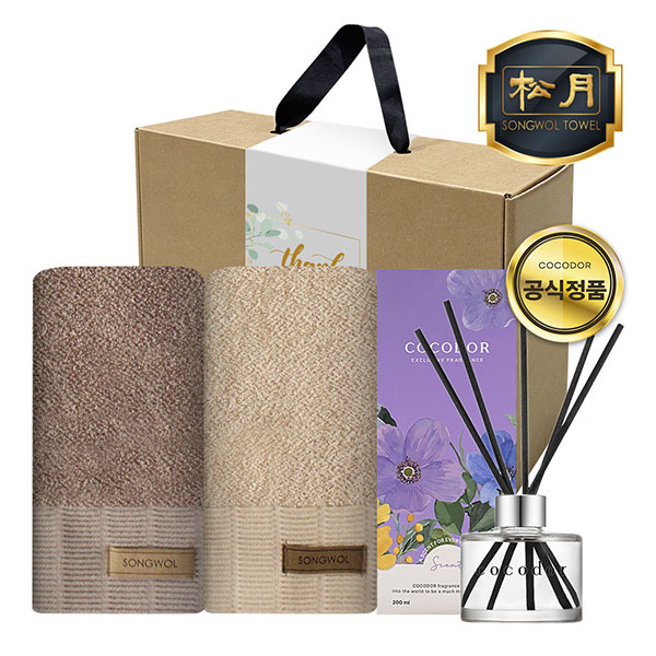 송월타월2장, 코코도르 디퓨저 1개, 일체형 손잡이박스, 속지, 감사스티커(랜덤)