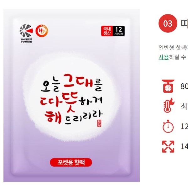 따뜻함이 오래가고 온도가 일정한 국산 핫팩 입니다.