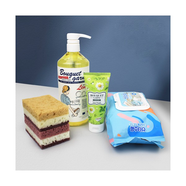 | 기타사항 | 부케가르니 주방세제 750ml + 부케가르니 핸드크림 캐모마일 100g + 세균닦는 도톰한 행주티슈 70매 + 떡수세미 2개 + 끈케이스 스티커 제작 및 부착 별도문의 |