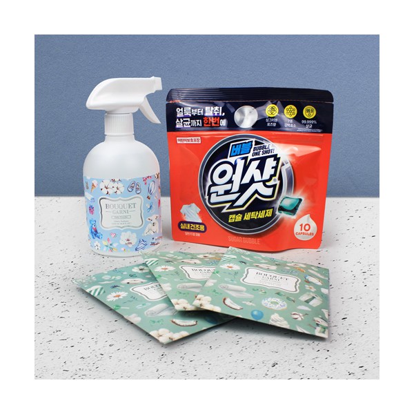 | 기타사항 | 슈가버블 버블원샷 캡슐세제+부케가르니 섬유탈취제 500ml+부케가르니; 옷장 방향제(샤쉐) 3매입+끈케이스 스티커 제작 및 부착 별도문의 |