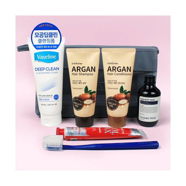 | 기타사항 | 과일나라 아르간 샴푸+컨디셔너 + 바세린 클렌징폼 + 나드(NARD) 바디워시 + 크리오 치약칫솔 + 여행용파우치 여행용파우치 실크1도인쇄 별도문의 종이케이스 별도문의 크라프트 끈케이스 별도문의 케이스 스티커 부착 별도문의 |