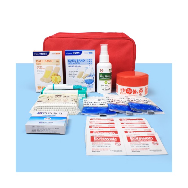 | 기타사항 | 대일밴드 오리지널 표준형8매 대형4매+아쿠아 방수밴드 표준형8매 대형4매 + 스프레이 과산화수소수 + 코튼볼 알콜솜 + 닥터스킨 상처 연고 + 멸균거즈 3개 + 멸균면봉 100매입 + 면반창고 + 알콜스왑 10매 + 구급파우치 구급파우치 인쇄 별도문의 종이케이스 추가 별도문의 |