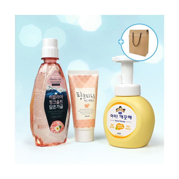 | 기타사항 | LG생활건강 핑크솔트 가글 320ml + 아이깨끗해 핸드워시 + 과일나라 핑크피치 핸드크림 + 끈케이스 스티커 제작 및 부착 별도문의 케이스 이미지 변경 가능, 상세페이지 참조 (어려운이웃 복지사각 / 치매예방 / 금연홍보 / 슬기로운 안전생활) |