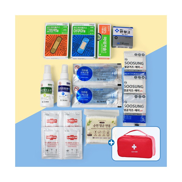 | 기타사항 | 동국제약 고탄력밴드 10매 + 아쿠아 방수밴드10매 + 마데카솔 연고 8g + 반창고 + 과산화수소수 소독 스프레이 + 에탄올 소독 스프레이 + 스틱스왑 2매입 2개 + 멸균가제 3개 + 순면멸균면봉100매 + 랩신손소독티슈4개 + 구급파우치 구급파우치 실크1도 인쇄 별도문의 종이케이스 추가 별도문의 |