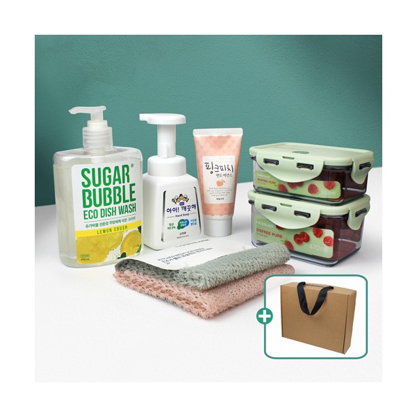 | 기타사항 | 슈가버블 주방세제 470ml + 주방전용 아이깨끗해 키친솝 + 락앤락 비스프리 밀폐용기 350ml + 락앤락 비스프리 밀폐용기 470m + 락앤락 망사수세미 + 과일나라 핸드에센스80g + 끈케이스 스티커 제작 및 부착 별도문의 |