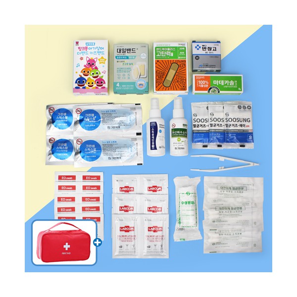 | 기타사항 | 핑크퐁 아기상어 키즈밴드 혼합 16매 + 대일밴드 안티스카 습윤밴드 + 동국제약 고탄력밴드 + 마데카솔 연고 + 면반창고 + 스틱스왑2매입 4개 + 에탄올 소독제 스프레이형 + 과산화수소수 소독제 스프레이형 + 멸균거즈 3개 + 핀셋 + 상처 처치용 소독면봉 + 붕대 + 알콜스왑 10개 + 애경 랩신 손소독티슈 6개 + 구급파우치 구급파우치 실크1도 인쇄 별도문의 끈케이스 추가 별도문의 |